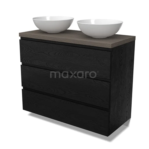 Modulo Plato Badmöbel mit Aufsatzwaschbecken | 100 cm Schwarze Eiche Grifflos front Dunkelbraune Eiche blatt 3 Schubladen