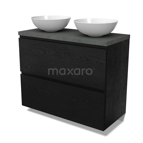 Modulo Plato Badmöbel mit Aufsatzwaschbecken | 100 cm Schwarze Eiche Grifflos front Dunkelgrauer Beton blatt 2 hohe Schubladen übereinanderliegend