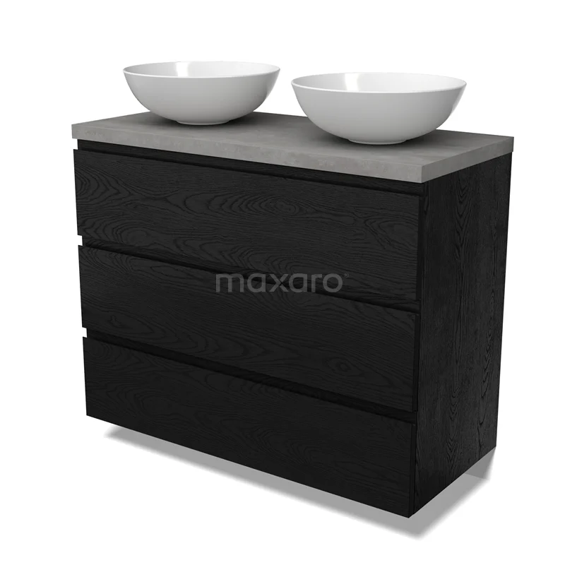 Modulo Plato Badmöbel mit Aufsatzwaschbecken | 100 cm Schwarze Eiche Grifflos front Hellgrauer Beton blatt 3 Schubladen
