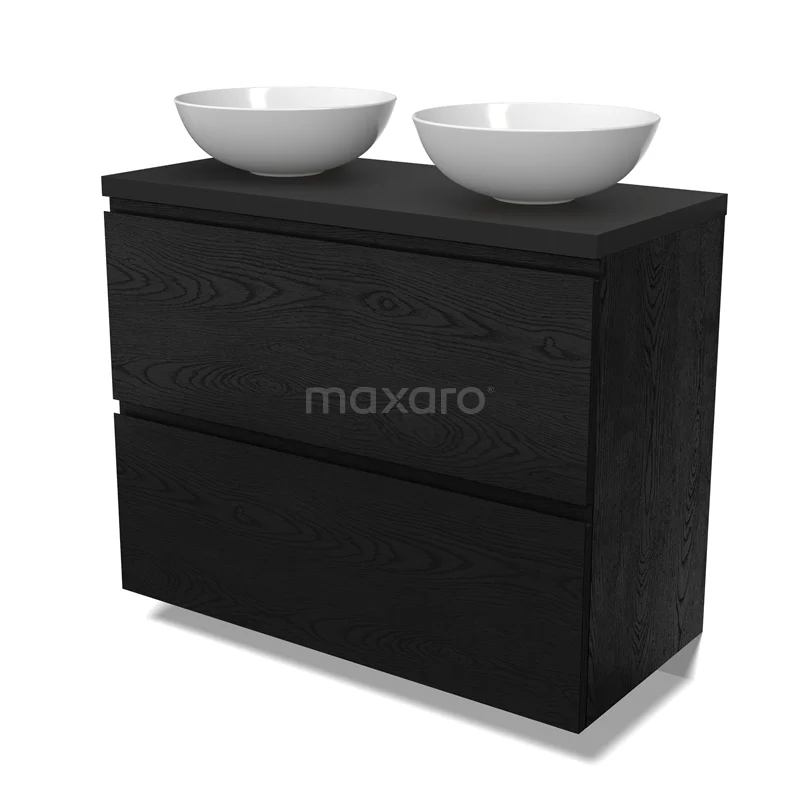 Modulo Plato Badmöbel mit Aufsatzwaschbecken | 100 cm Schwarze Eiche Grifflos front Matt Schwarz blatt 2 hohe Schubladen übereinanderliegend