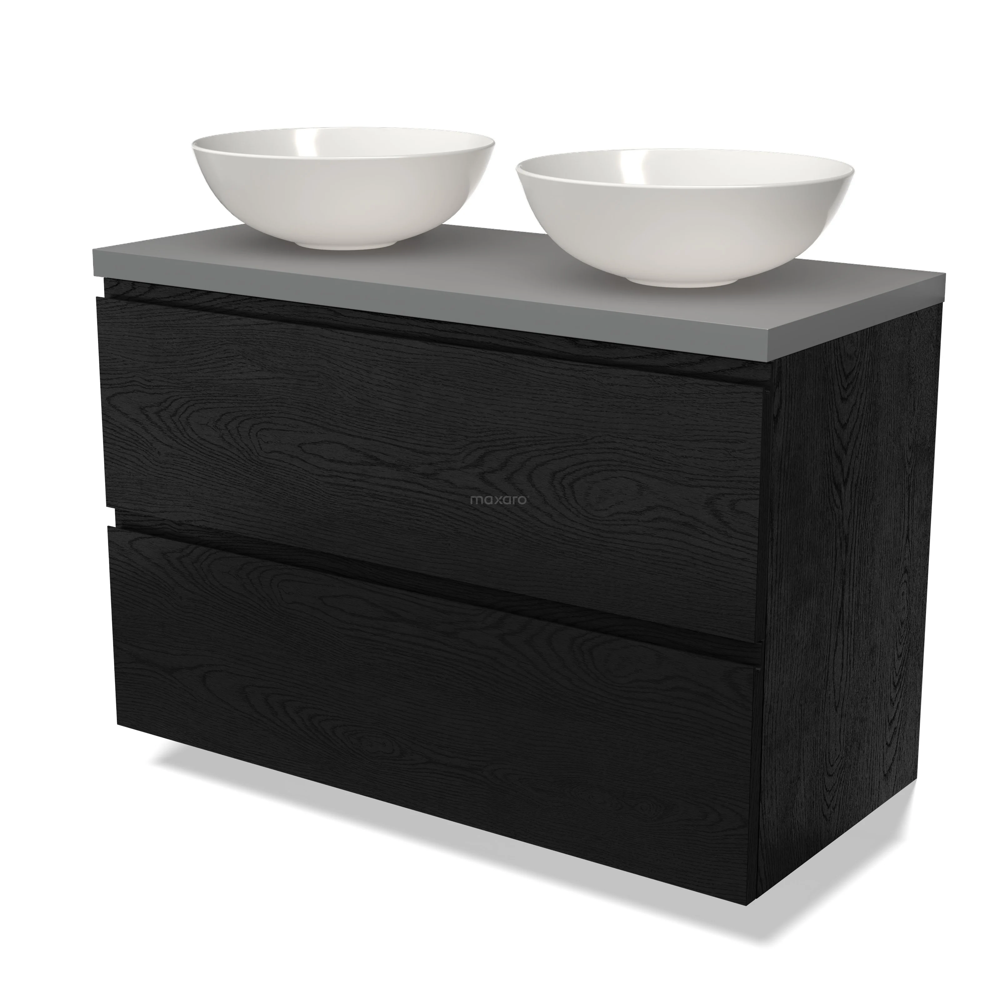 Modulo Plato Badmöbel mit Aufsatzwaschbecken | 100 cm Schwarze Eiche Grifflos front Mittelgrau blatt 2 übereinanderliegende Schubladen