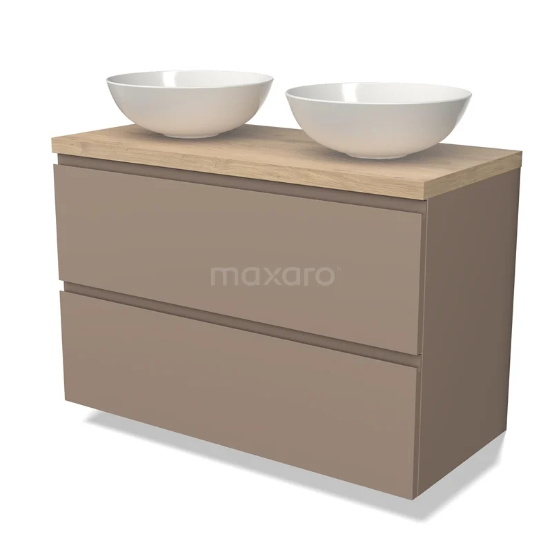 Modulo Plato Badmöbel mit Aufsatzwaschbecken | 100 cm Taupe Grifflos front Hellbraune Eiche blatt 2 übereinanderliegende Schubladen