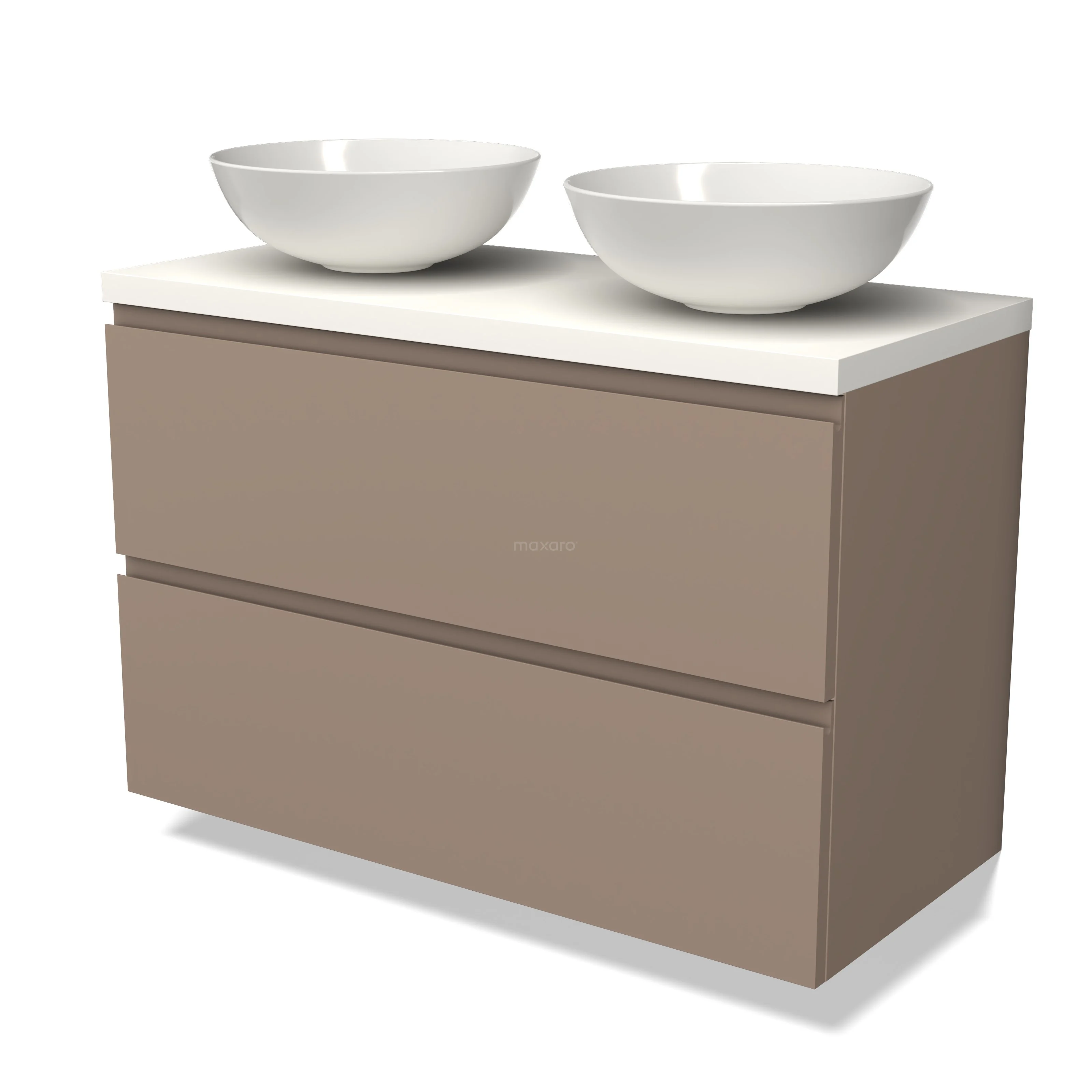 Modulo Plato Badmöbel mit Aufsatzwaschbecken | 100 cm Taupe Grifflos front Matt Weiß blatt 2 übereinanderliegende Schubladen