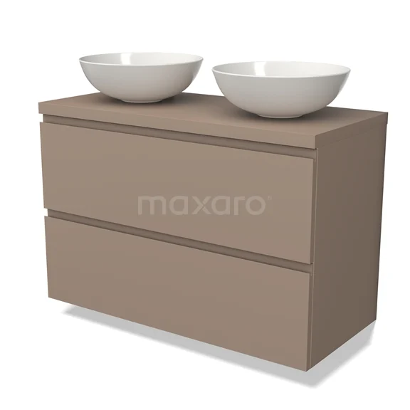 Modulo Plato Badmöbel mit Aufsatzwaschbecken | 100 cm Taupe Grifflos front Taupe blatt 2 übereinanderliegende Schubladen