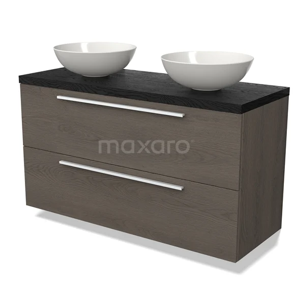 Modulo Plato Badmöbel mit Aufsatzwaschbecken | 120 cm Dunkelbraune Eiche Flach front Schwarze Eiche blatt 2 übereinanderliegende Schubladen