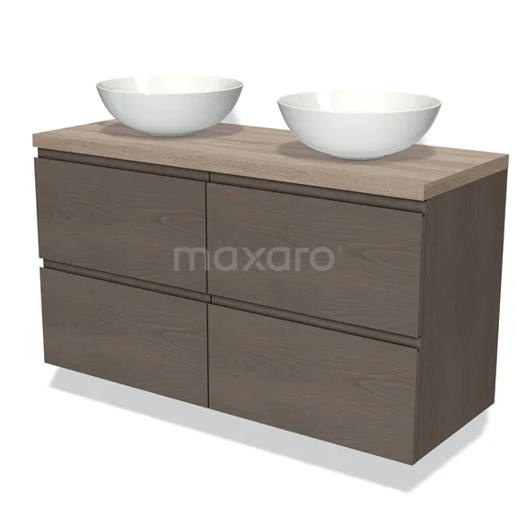 Modulo Plato Badmöbel mit Aufsatzwaschbecken | 120 cm Dunkelbraune Eiche Grifflos front Eiche blatt 4 Schubladen