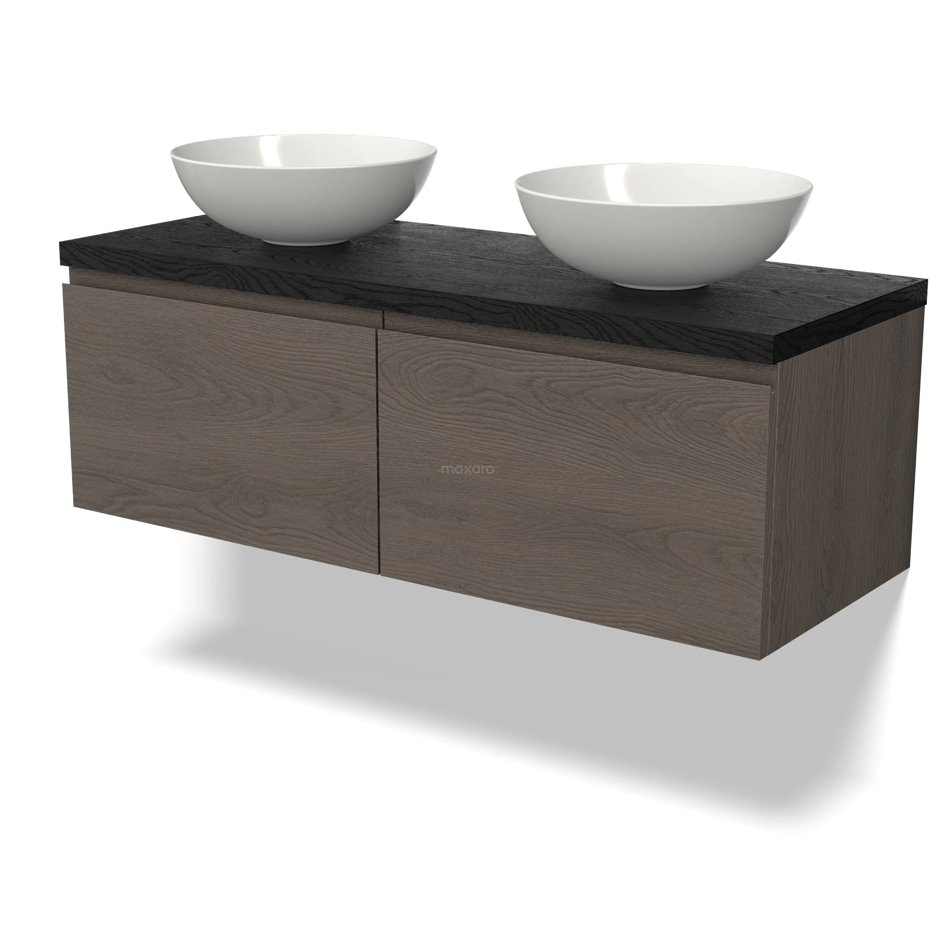 Modulo Plato Badmöbel mit Aufsatzwaschbecken | 120 cm Dunkelbraune Eiche Grifflos front Schwarze Eiche blatt 2 nebeneinanderliegende Schubladen