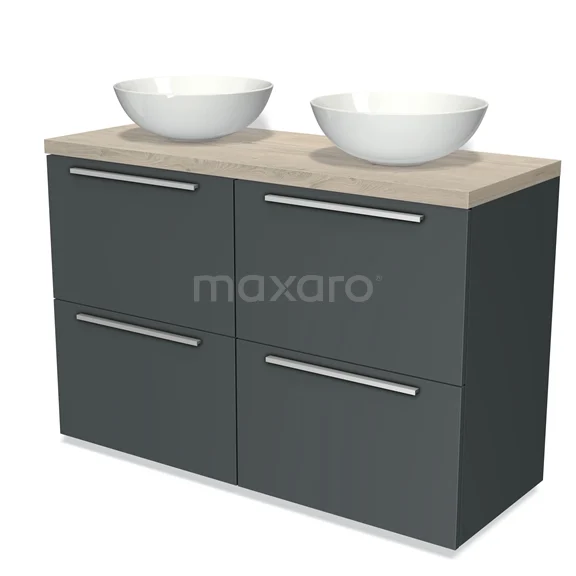 Modulo Plato Badmöbel mit Aufsatzwaschbecken | 120 cm Dunkelgrau Flach front Hellgraue Eiche blatt 4 hohe Schubladen