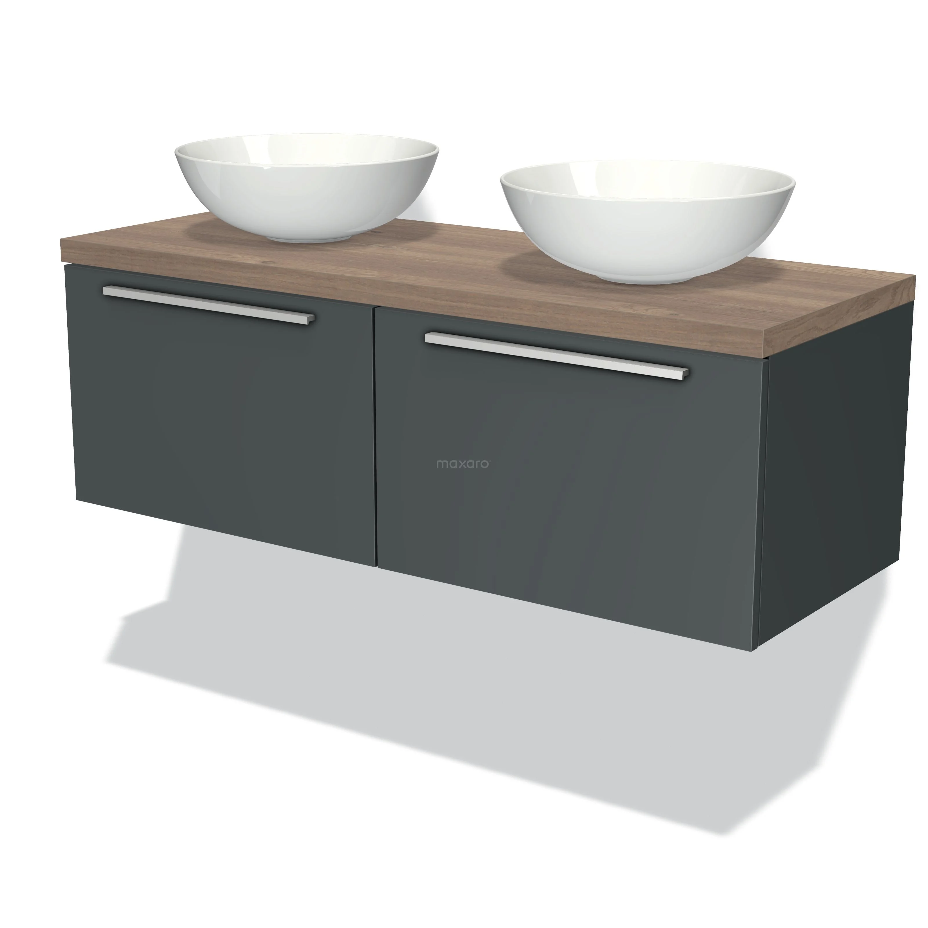 Modulo Plato Badmöbel mit Aufsatzwaschbecken | 120 cm Dunkelgrau Flach front Mittelbraune Eiche blatt 2 nebeneinanderliegende Schubladen