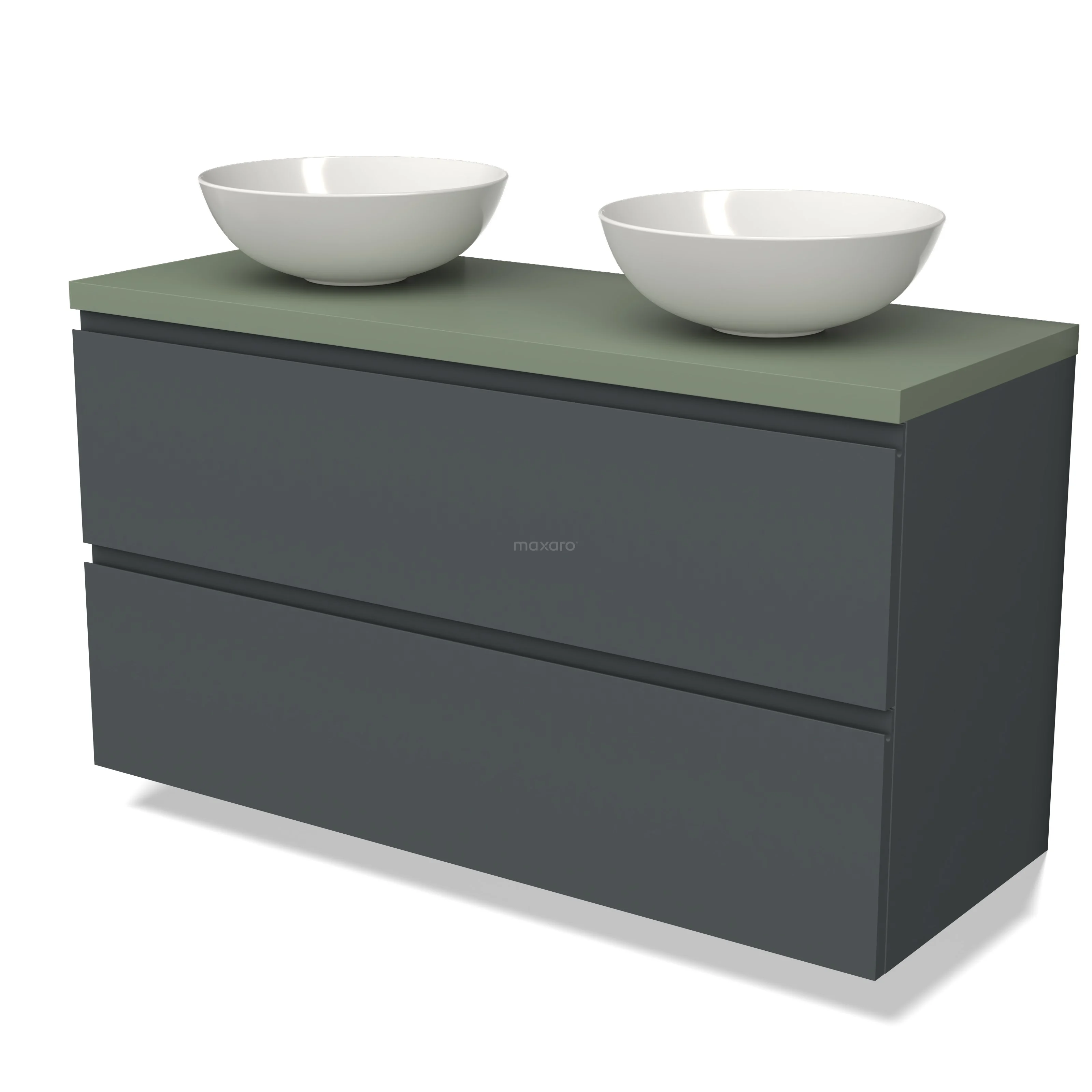 Modulo Plato Badmöbel mit Aufsatzwaschbecken | 120 cm Dunkelgrau Grifflos front Salbeigrün blatt 2 übereinanderliegende Schubladen