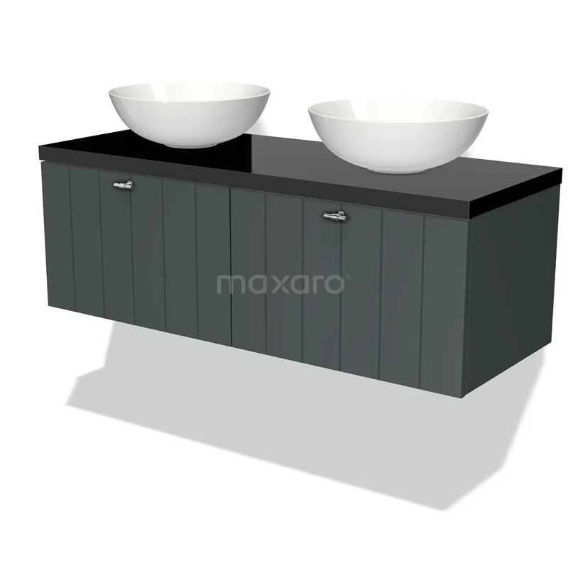 Modulo Plato Badmöbel mit Aufsatzwaschbecken | 120 cm Dunkelgrau Lamelle front Hochglanz Schwarz blatt 2 nebeneinanderliegende Schubladen