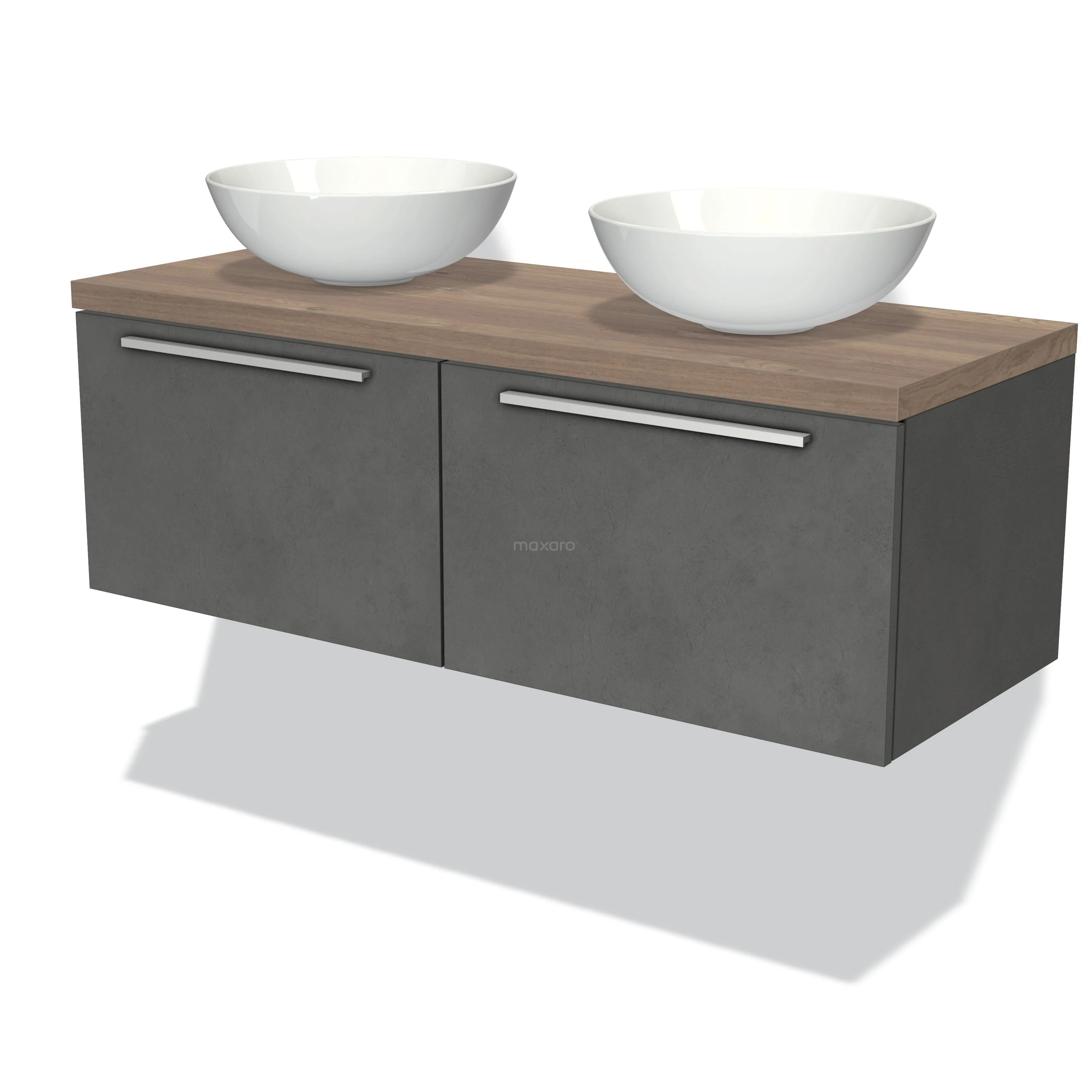 Modulo Plato Badmöbel mit Aufsatzwaschbecken | 120 cm Dunkelgrauer Beton Flach front Mittelbraune Eiche blatt 2 nebeneinanderliegende Schubladen