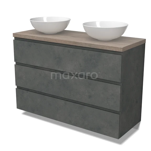 Modulo Plato Badmöbel mit Aufsatzwaschbecken | 120 cm Dunkelgrauer Beton Grifflos front Eiche blatt 3 Schubladen