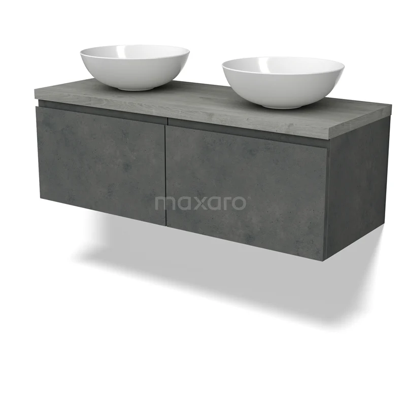 Modulo Plato Badmöbel mit Aufsatzwaschbecken | 120 cm Dunkelgrauer Beton Grifflos front Graue Eiche blatt 2 nebeneinanderliegende Schubladen