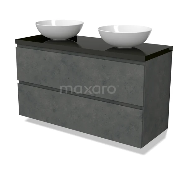 Modulo Plato Badmöbel mit Aufsatzwaschbecken | 120 cm Dunkelgrauer Beton Grifflos front Hochglanz Schwarz blatt 2 übereinanderliegende Schubladen