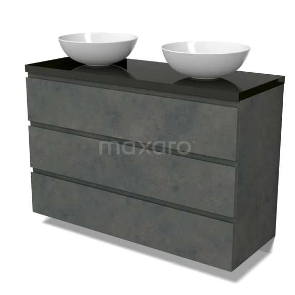 Modulo Plato Badmöbel mit Aufsatzwaschbecken | 120 cm Dunkelgrauer Beton Grifflos front Hochglanz Schwarz blatt 3 Schubladen