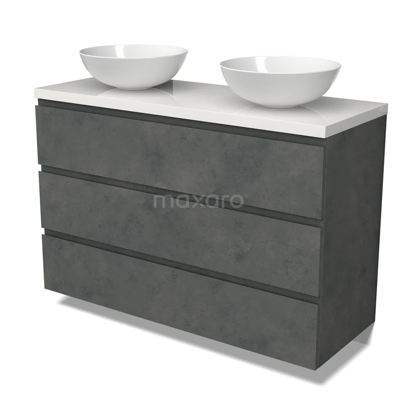 Modulo Plato Badmöbel mit Aufsatzwaschbecken | 120 cm Dunkelgrauer Beton Grifflos front Hochglanz Weiß blatt 3 Schubladen