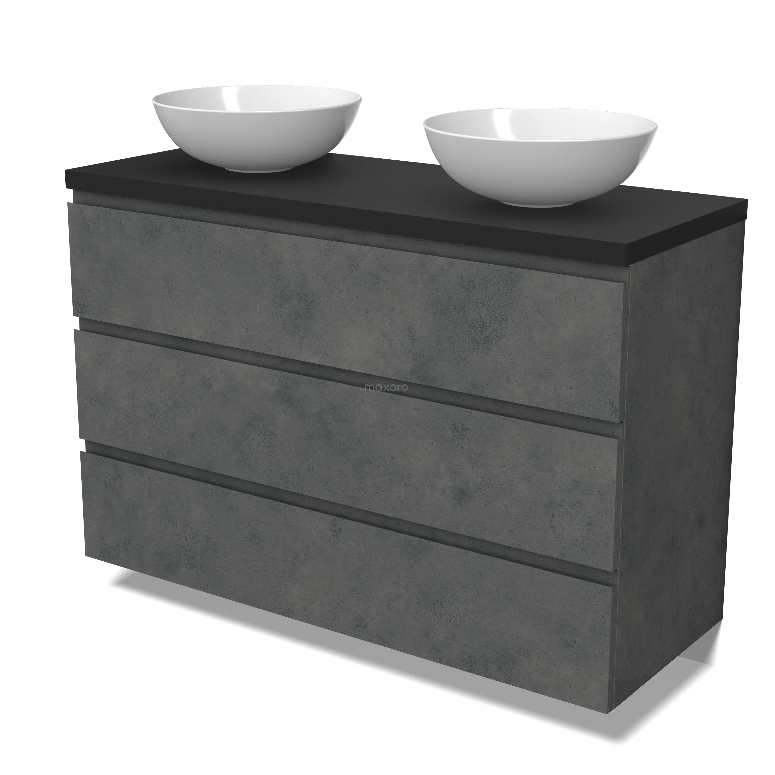 Modulo Plato Badmöbel mit Aufsatzwaschbecken | 120 cm Dunkelgrauer Beton Grifflos front Matt Schwarz blatt 3 Schubladen