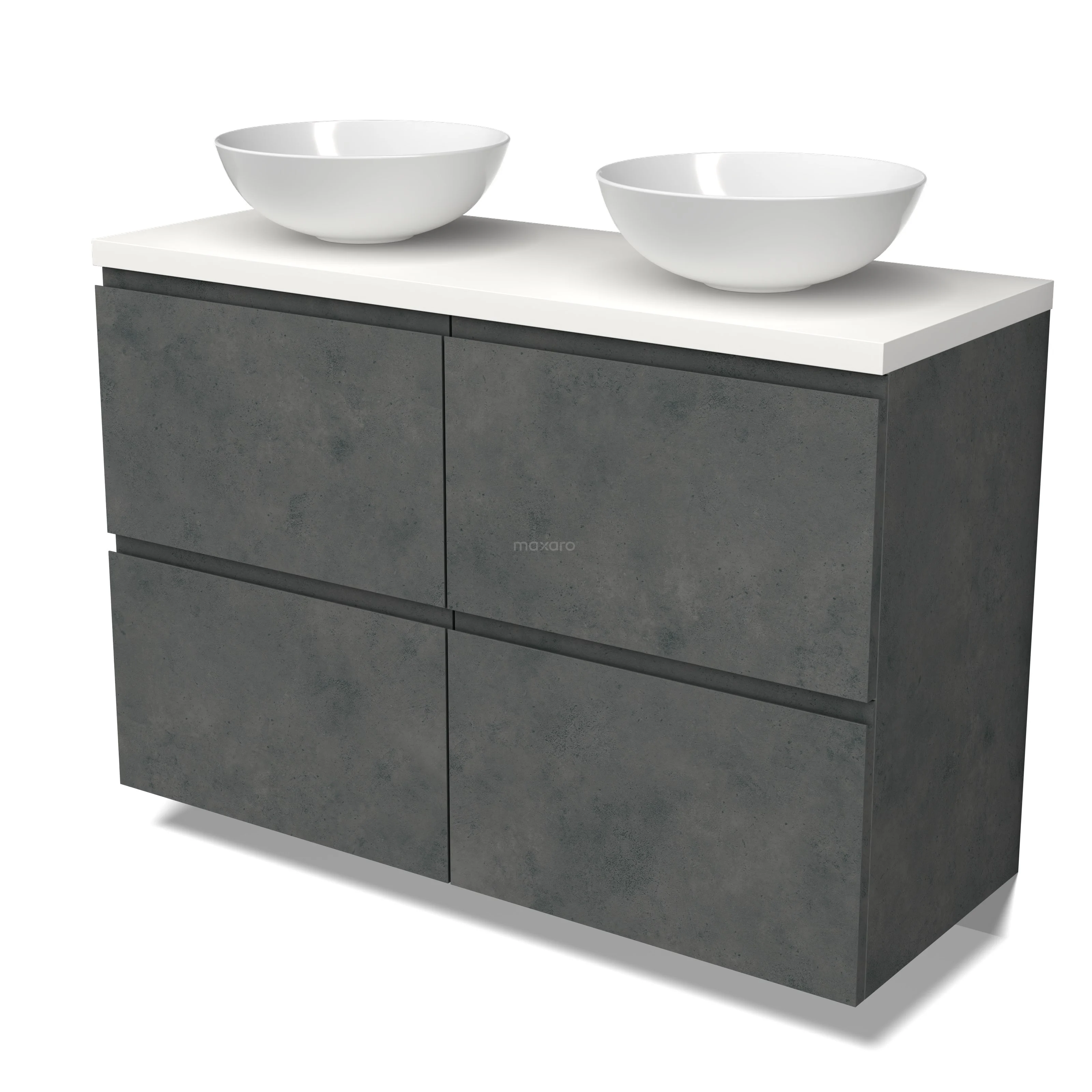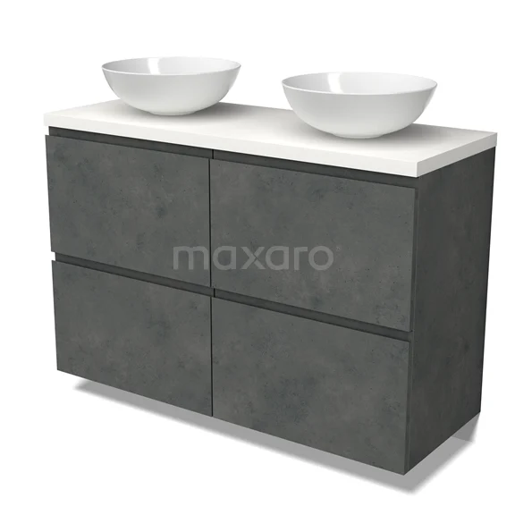 Modulo Plato Badmöbel mit Aufsatzwaschbecken | 120 cm Dunkelgrauer Beton Grifflos front Matt Weiß blatt 4 hohe Schubladen
