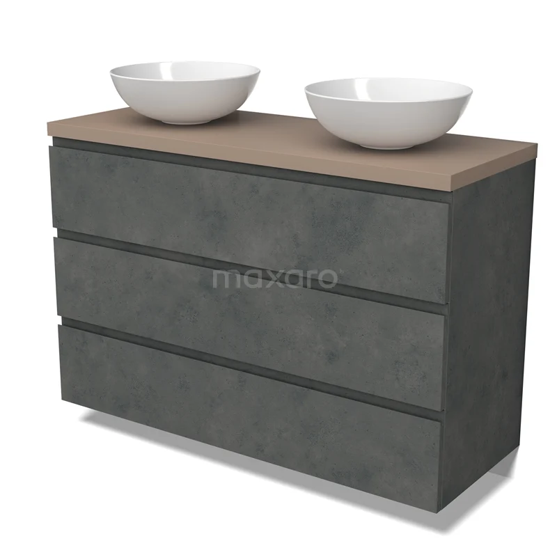 Modulo Plato Badmöbel mit Aufsatzwaschbecken | 120 cm Dunkelgrauer Beton Grifflos front Taupe blatt 3 Schubladen