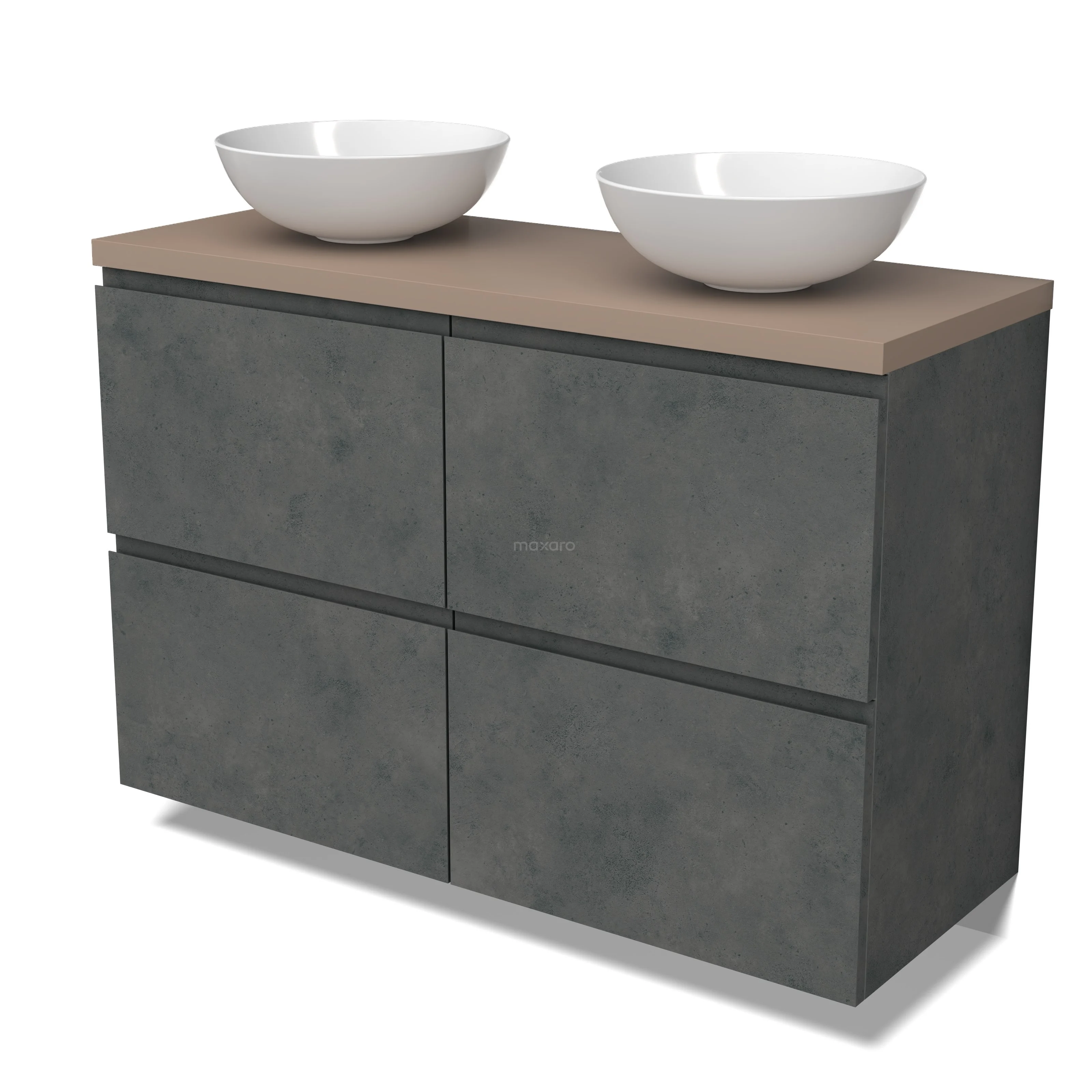 Modulo Plato Badmöbel mit Aufsatzwaschbecken | 120 cm Dunkelgrauer Beton Grifflos front Taupe blatt 4 hohe Schubladen