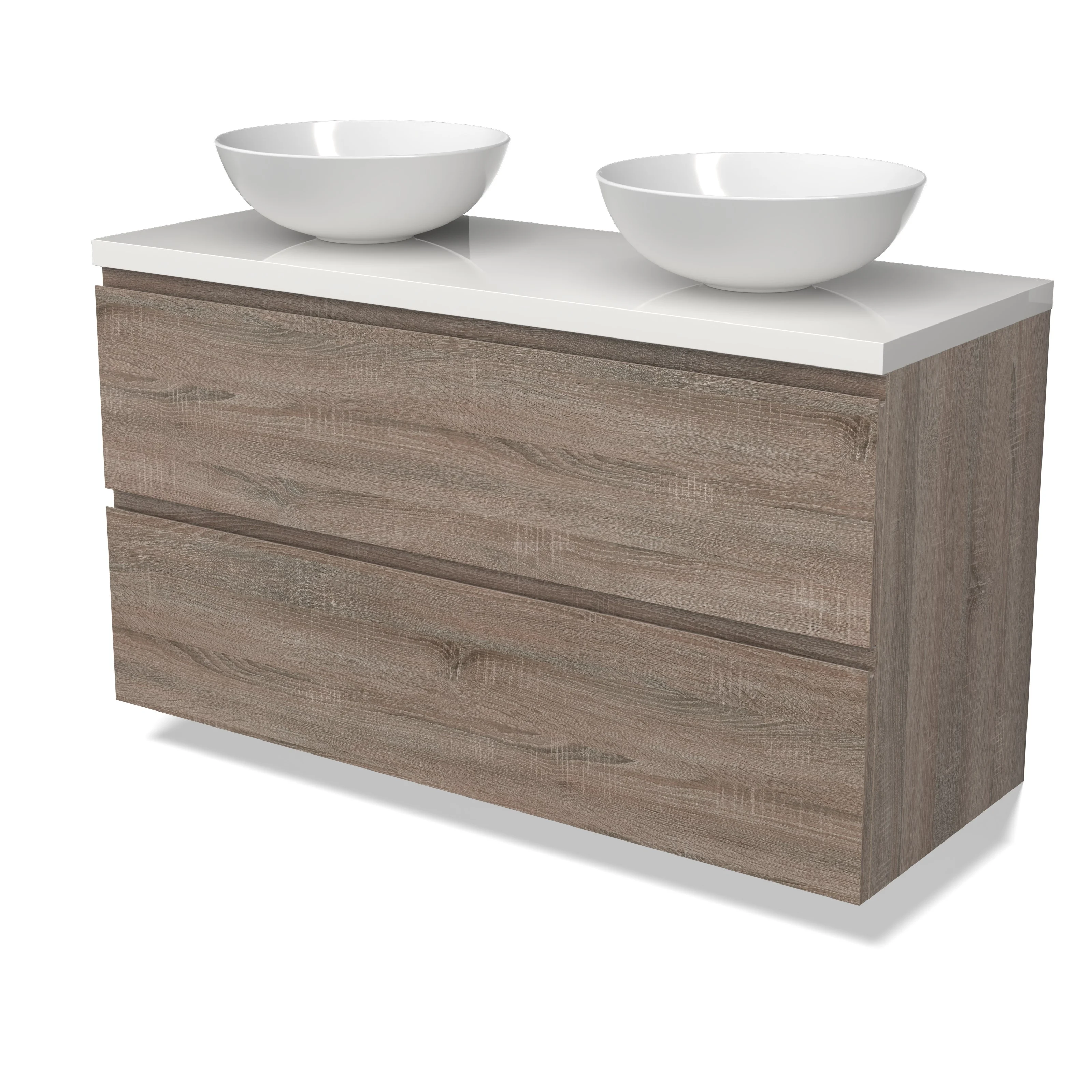 Modulo Plato Badmöbel mit Aufsatzwaschbecken | 120 cm Eiche Grifflos front Hochglanz Weiß blatt 2 übereinanderliegende Schubladen