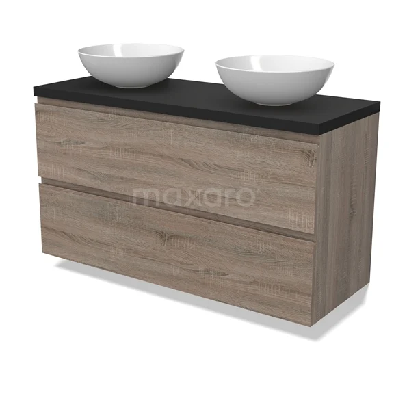 Modulo Plato Badmöbel mit Aufsatzwaschbecken | 120 cm Eiche Grifflos front Matt Schwarz blatt 2 übereinanderliegende Schubladen