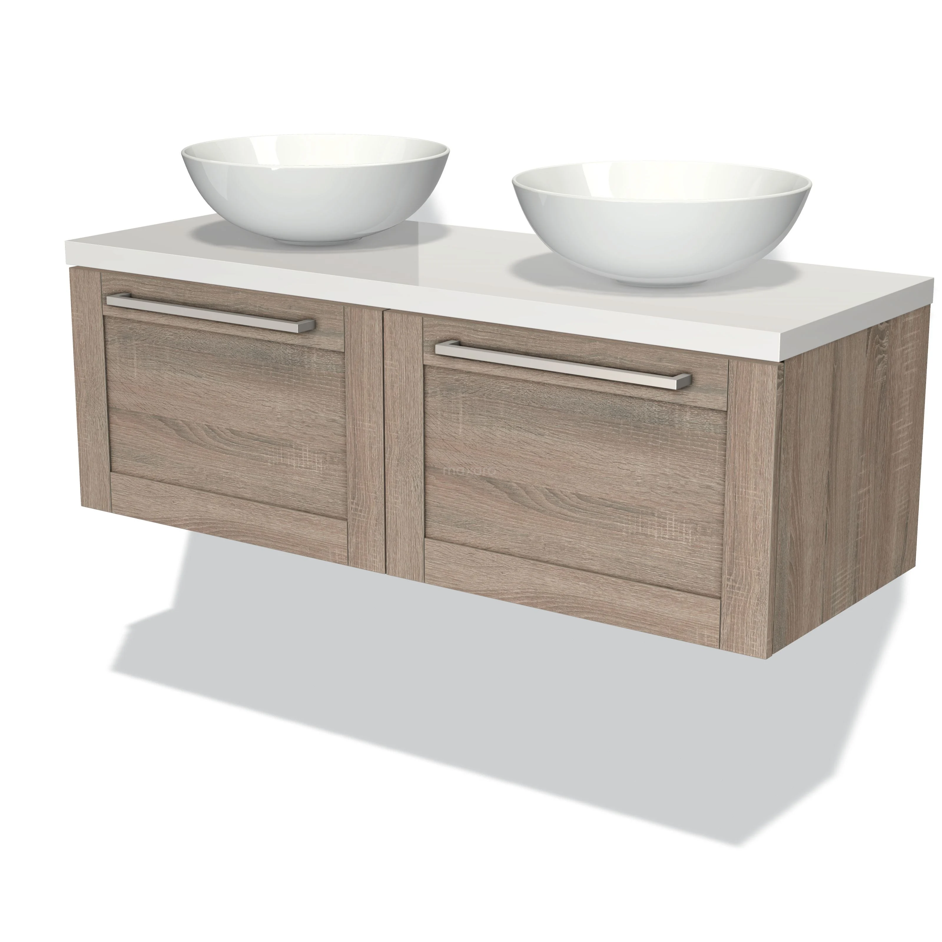 Modulo Plato Badmöbel mit Aufsatzwaschbecken | 120 cm Eiche Rahmen front Hochglanz Weiß blatt 2 nebeneinanderliegende Schubladen