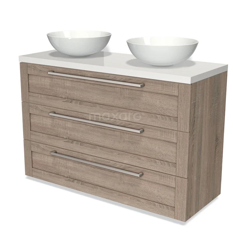 Modulo Plato Badmöbel mit Aufsatzwaschbecken | 120 cm Eiche Rahmen front Hochglanz Weiß blatt 3 Schubladen