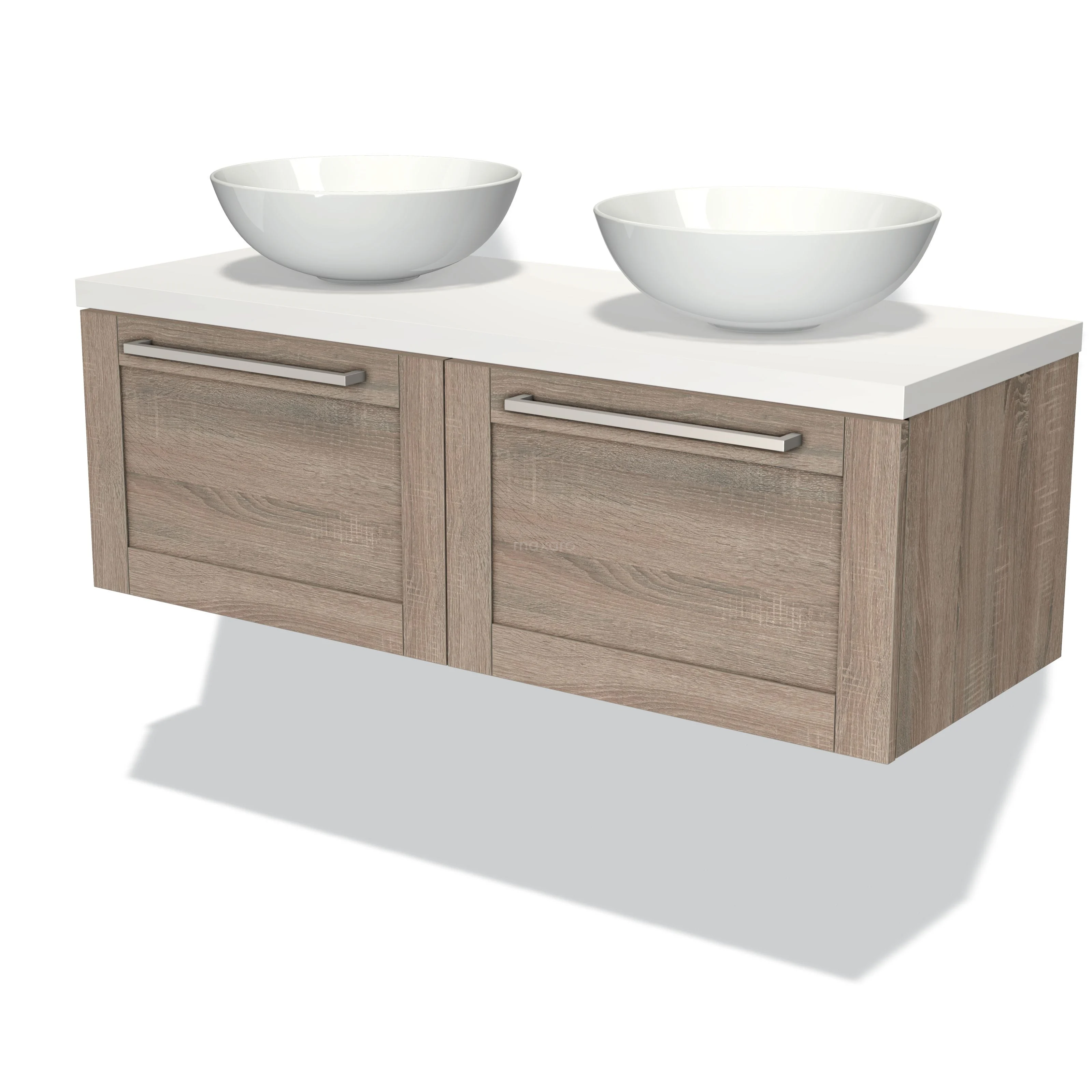 Modulo Plato Badmöbel mit Aufsatzwaschbecken | 120 cm Eiche Rahmen front Matt Weiß blatt 2 nebeneinanderliegende Schubladen