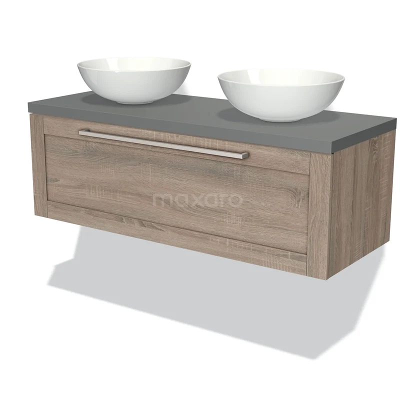 Modulo Plato Badmöbel mit Aufsatzwaschbecken | 120 cm Eiche Rahmen front Mittelgrau blatt 1 Schublade