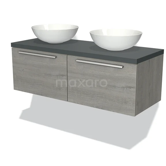Modulo Plato Badmöbel mit Aufsatzwaschbecken | 120 cm Graue Eiche Flach front Dunkelgrau blatt 2 nebeneinanderliegende Schubladen