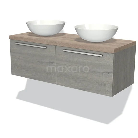 Modulo Plato Badmöbel mit Aufsatzwaschbecken | 120 cm Graue Eiche Flach front Eiche blatt 2 nebeneinanderliegende Schubladen