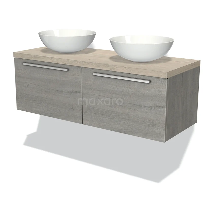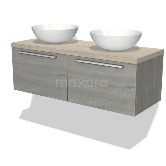 Modulo Plato Badmöbel mit Aufsatzwaschbecken | 120 cm Graue Eiche Flach front Hellgraue Eiche blatt 2 nebeneinanderliegende Schubladen