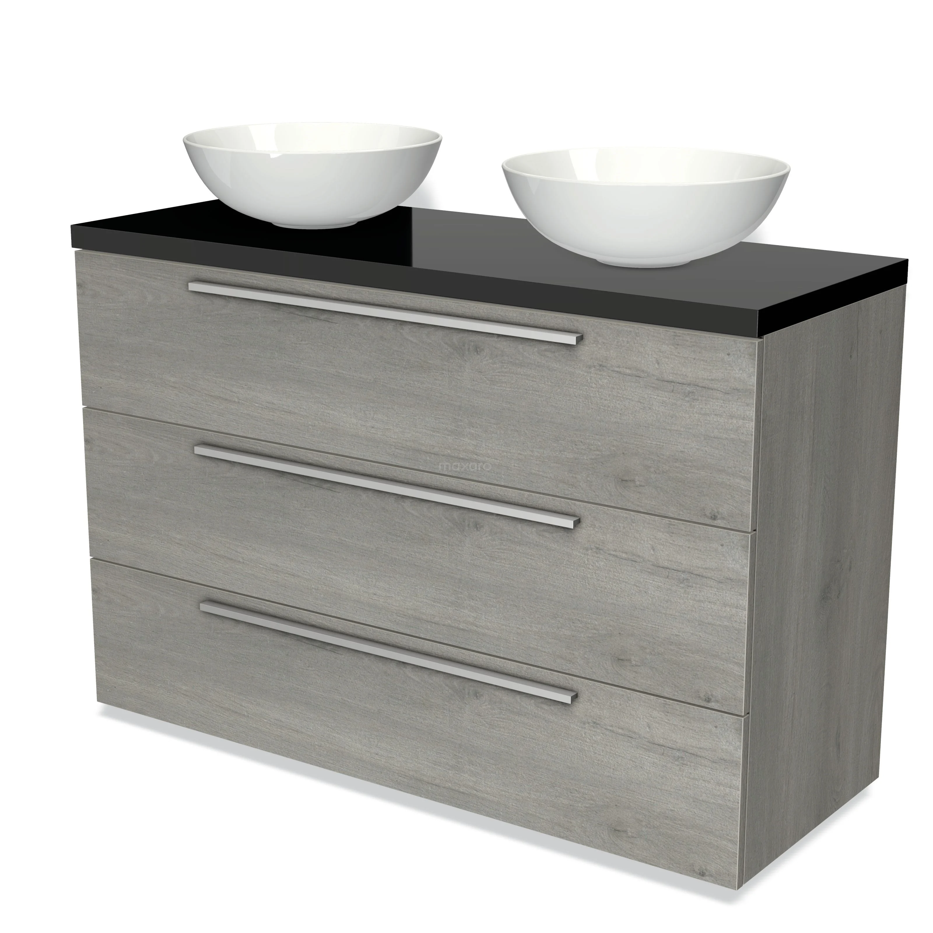 Modulo Plato Badmöbel mit Aufsatzwaschbecken | 120 cm Graue Eiche Flach front Hochglanz Schwarz blatt 3 Schubladen