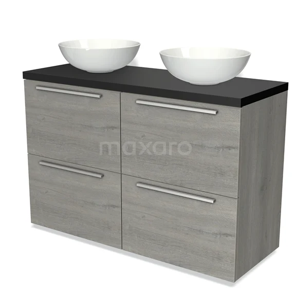 Modulo Plato Badmöbel mit Aufsatzwaschbecken | 120 cm Graue Eiche Flach front Matt Schwarz blatt 4 hohe Schubladen