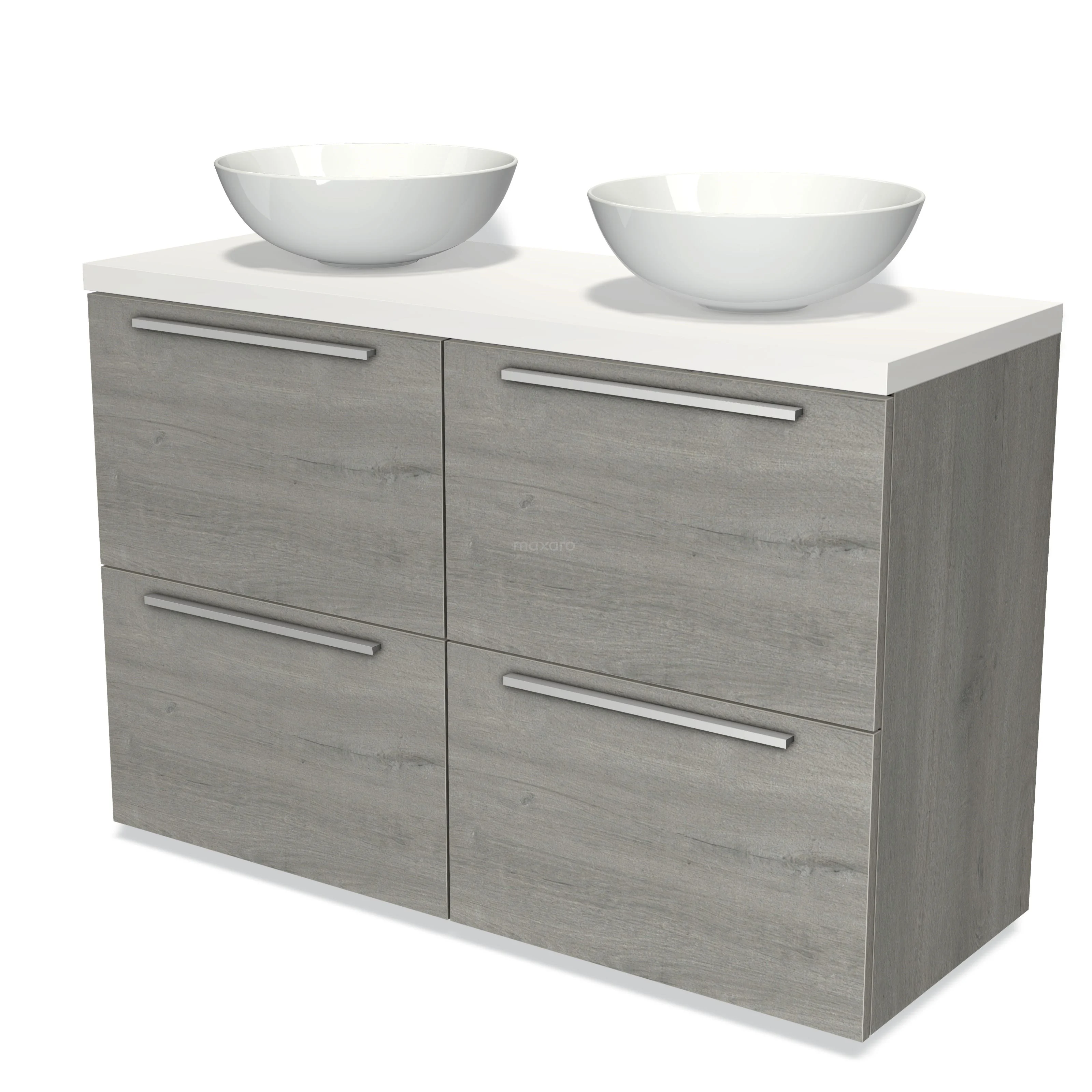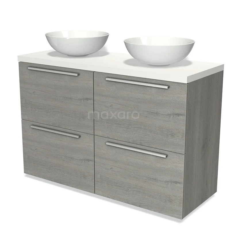 Modulo Plato Badmöbel mit Aufsatzwaschbecken | 120 cm Graue Eiche Flach front Matt Weiß blatt 4 hohe Schubladen
