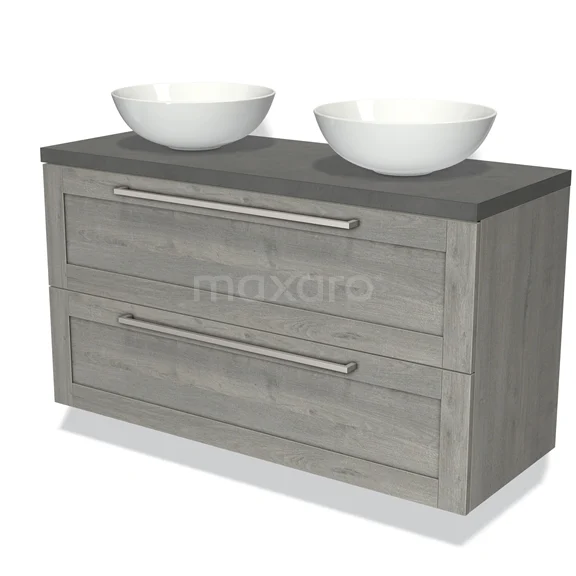 Modulo Plato Badmöbel mit Aufsatzwaschbecken | 120 cm Graue Eiche Rahmen front Dunkelgrauer Beton blatt 2 übereinanderliegende Schubladen