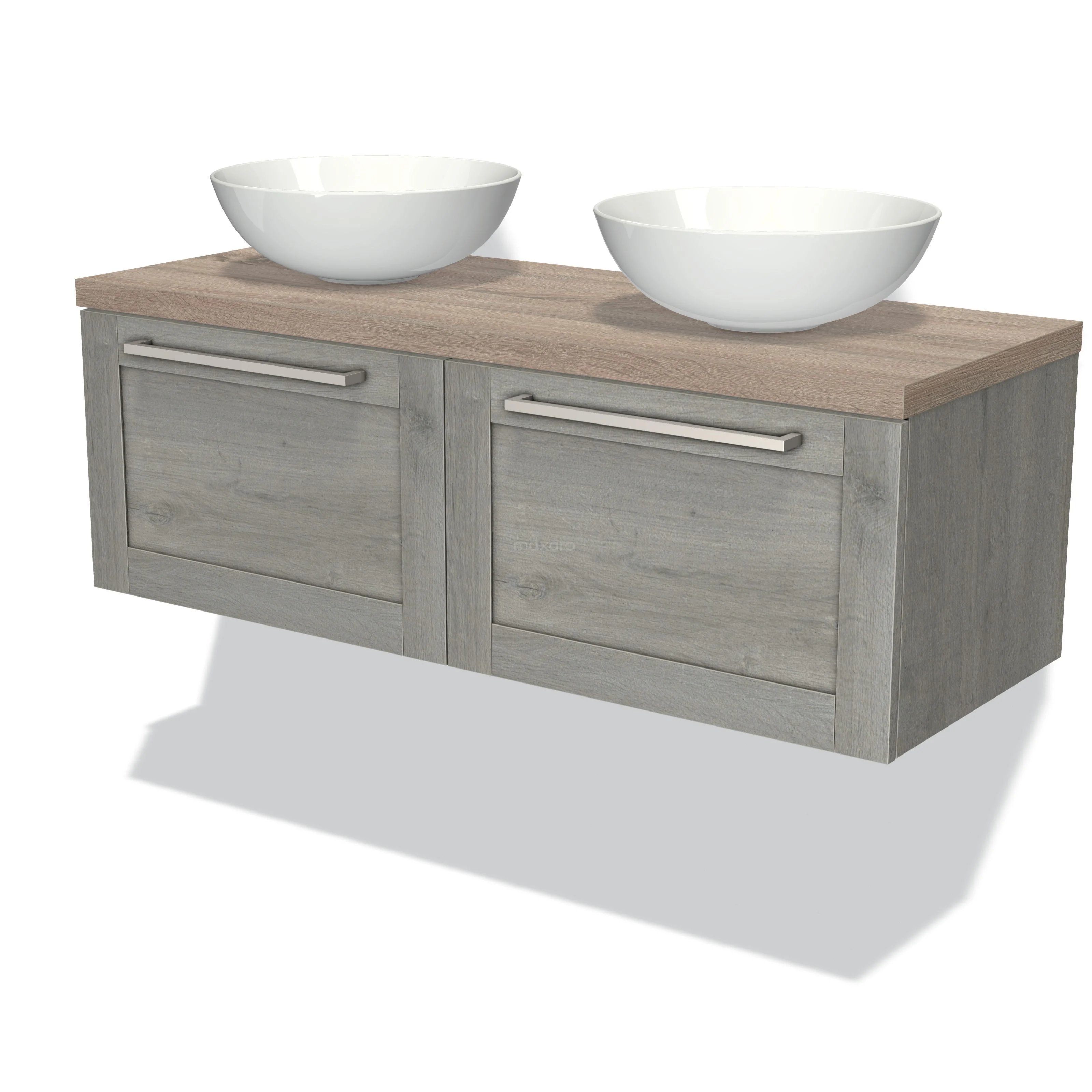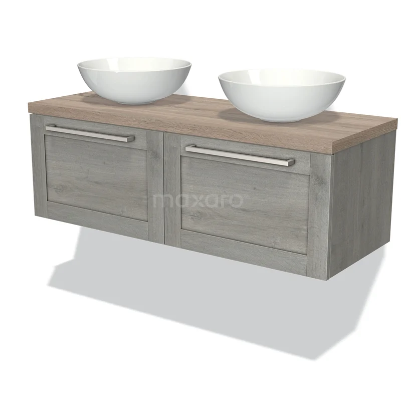 Modulo Plato Badmöbel mit Aufsatzwaschbecken | 120 cm Graue Eiche Rahmen front Eiche blatt 2 nebeneinanderliegende Schubladen