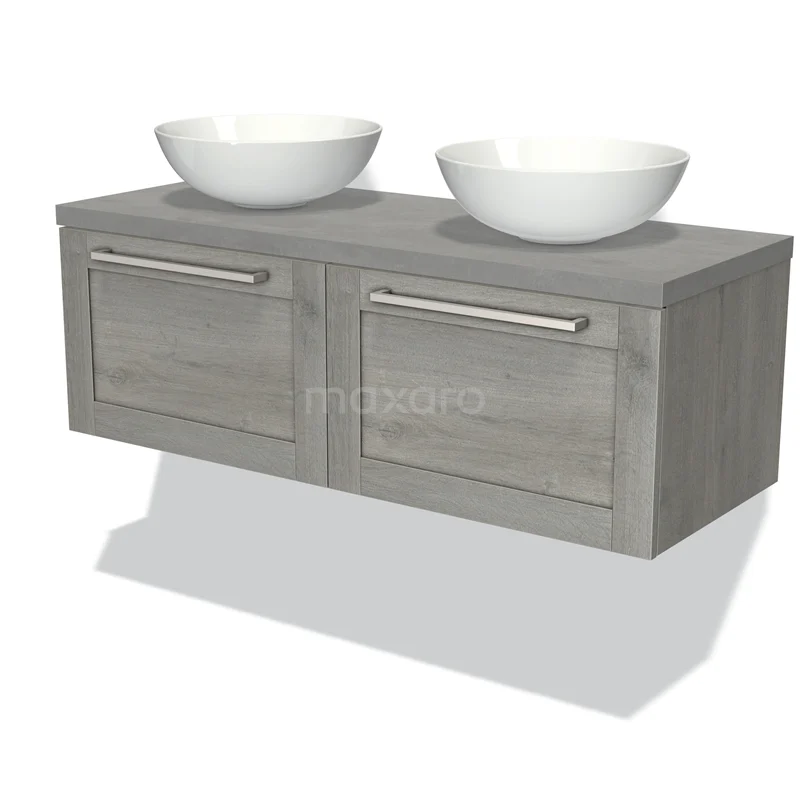 Modulo Plato Badmöbel mit Aufsatzwaschbecken | 120 cm Graue Eiche Rahmen front Hellgrauer Beton blatt 2 nebeneinanderliegende Schubladen