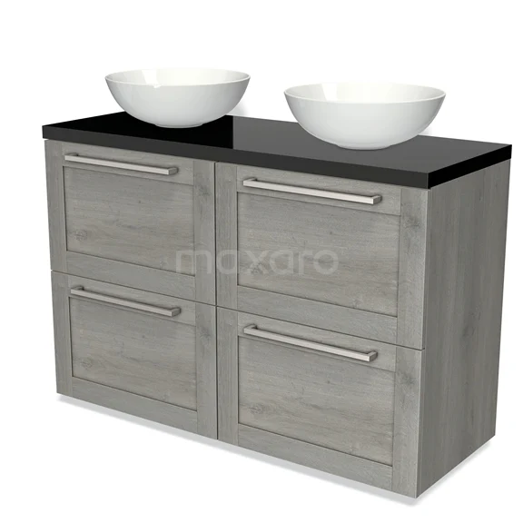 Modulo Plato Badmöbel mit Aufsatzwaschbecken | 120 cm Graue Eiche Rahmen front Hochglanz Schwarz blatt 4 hohe Schubladen