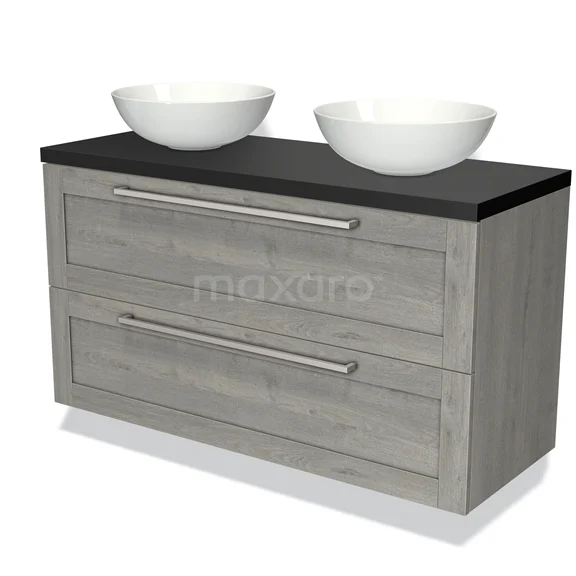 Modulo Plato Badmöbel mit Aufsatzwaschbecken | 120 cm Graue Eiche Rahmen front Matt Schwarz blatt 2 übereinanderliegende Schubladen