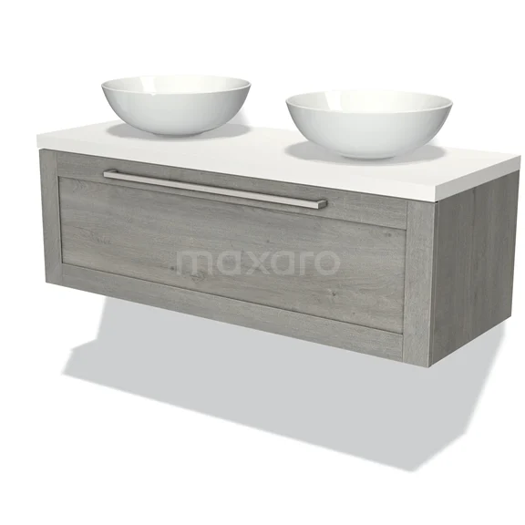 Modulo Plato Badmöbel mit Aufsatzwaschbecken | 120 cm Graue Eiche Rahmen front Matt Weiß blatt 1 Schublade