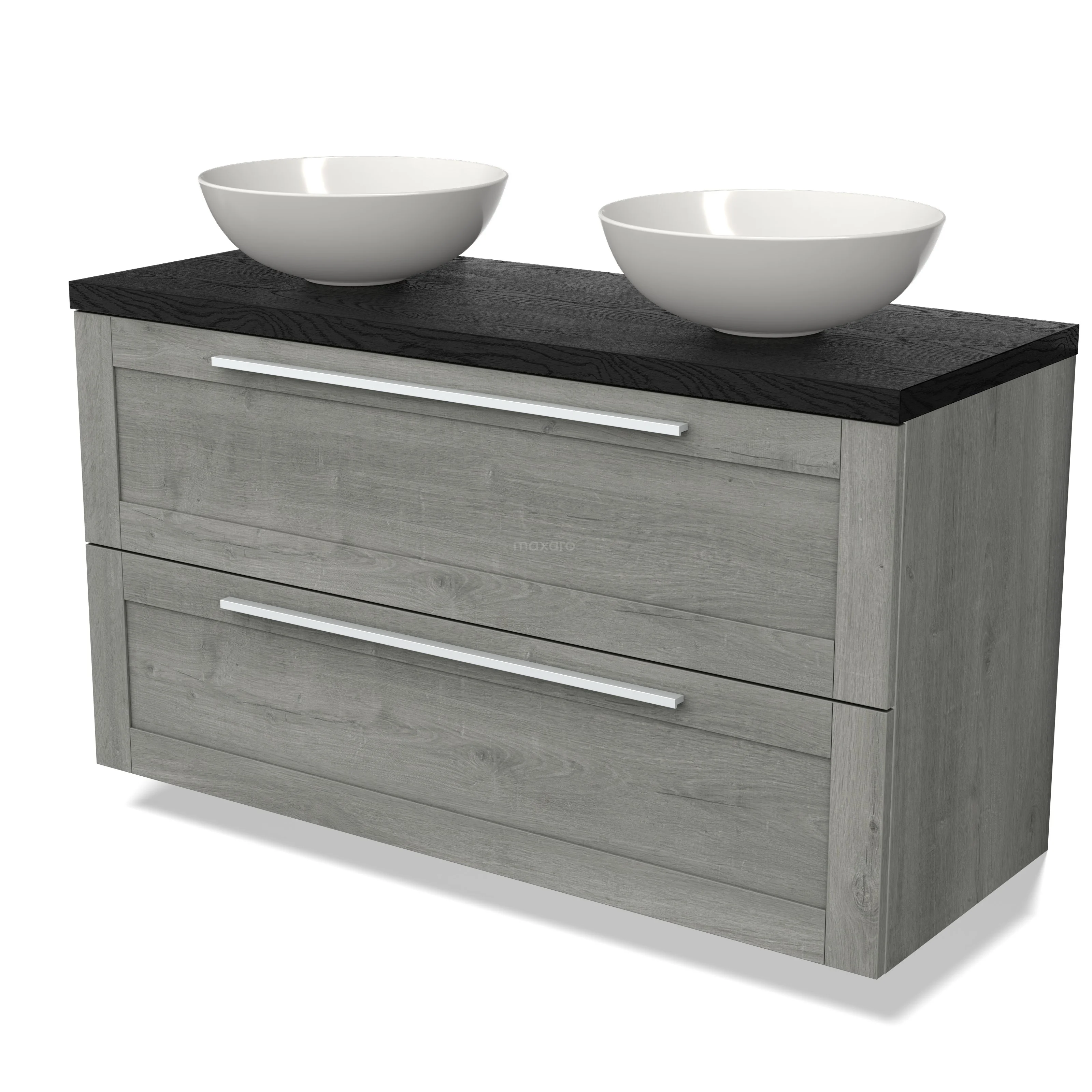 Modulo Plato Badmöbel mit Aufsatzwaschbecken | 120 cm Graue Eiche Rahmen front Schwarze Eiche blatt 2 übereinanderliegende Schubladen