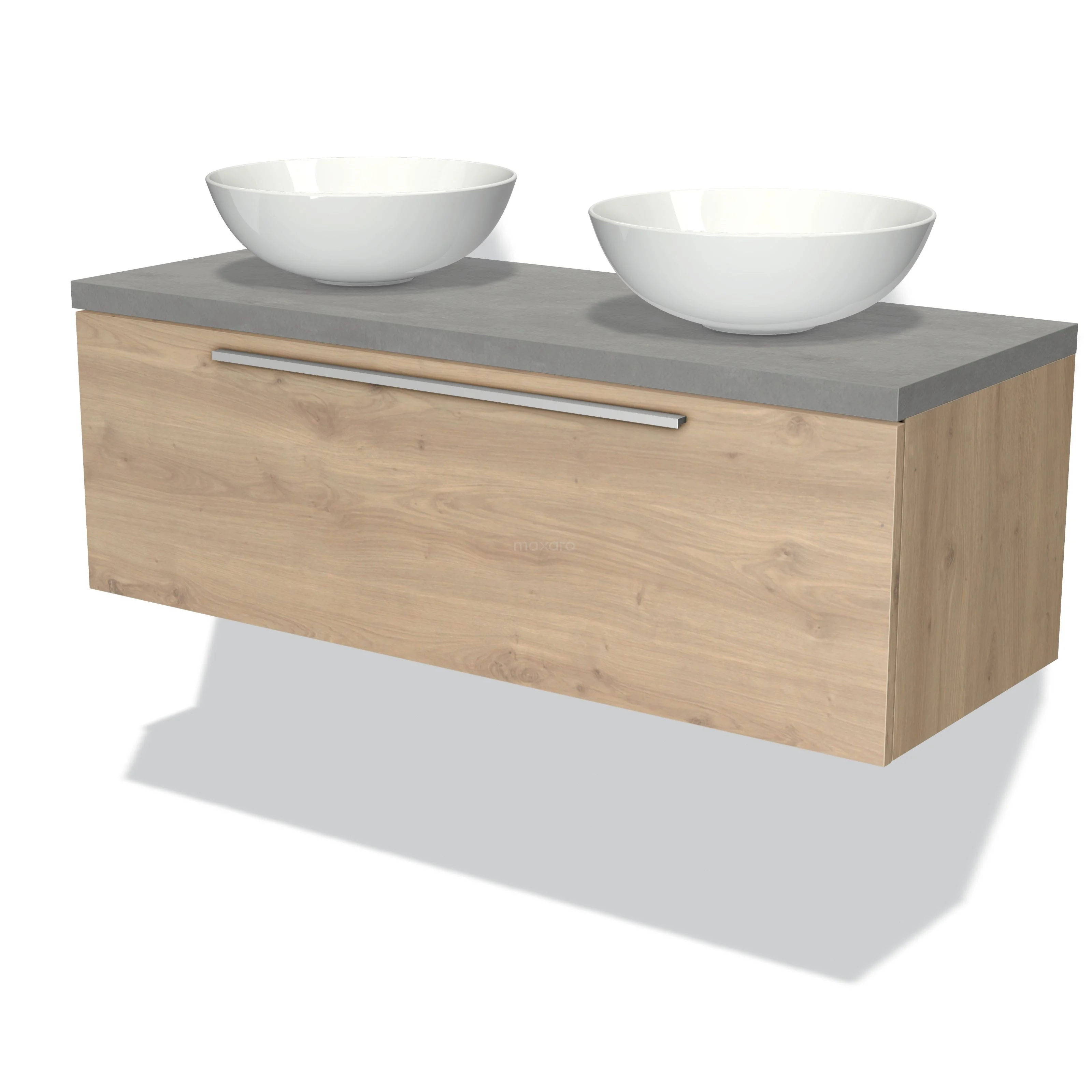 Modulo Plato Badmöbel mit Aufsatzwaschbecken | 120 cm Hellbraune Eiche Flach front Hellgrauer Beton blatt 1 Schublade