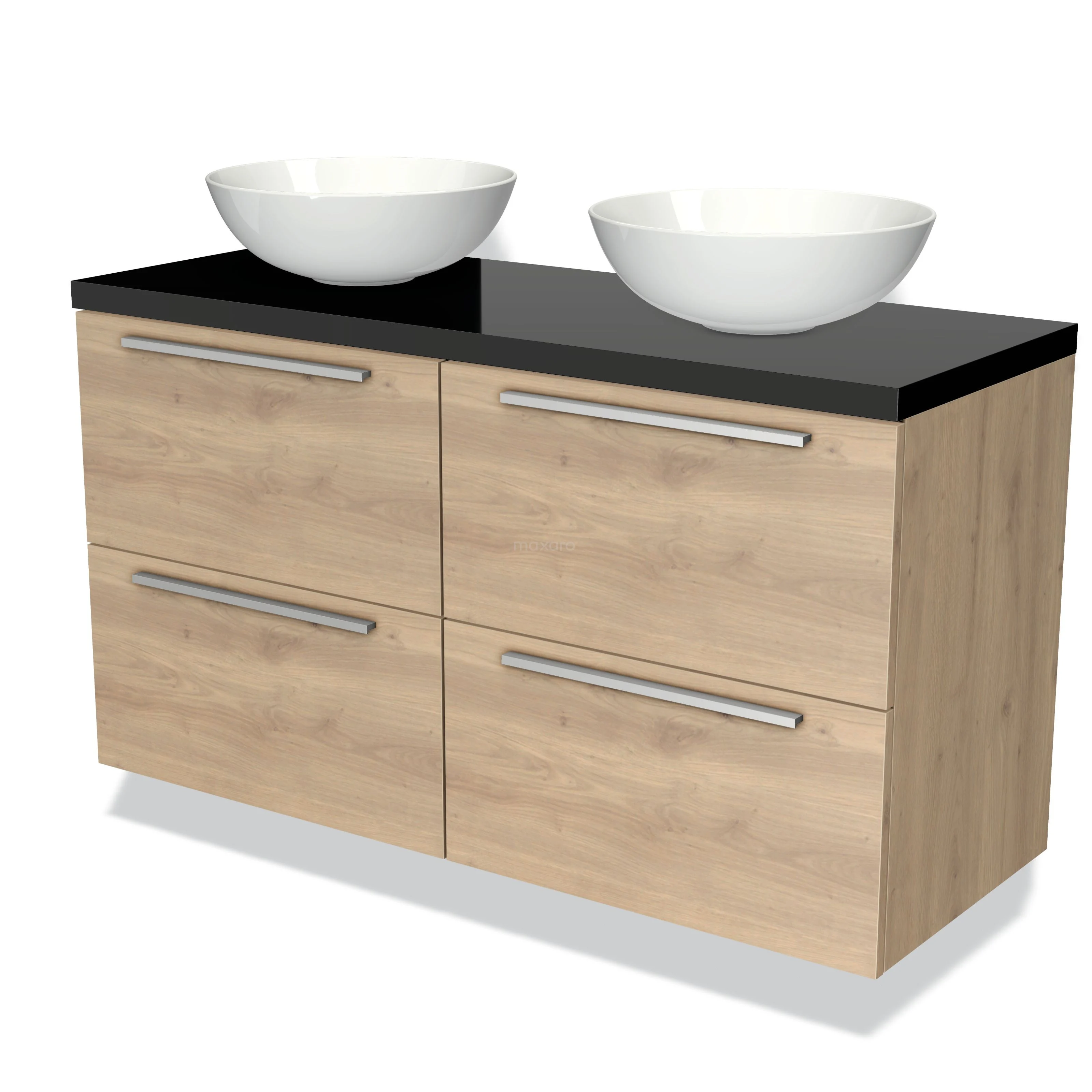 Modulo Plato Badmöbel mit Aufsatzwaschbecken | 120 cm Hellbraune Eiche Flach front Hochglanz Schwarz blatt 4 Schubladen