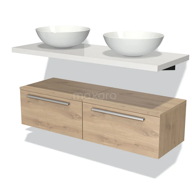 Modulo Plato Badmöbel mit Aufsatzwaschbecken | 120 cm Hellbraune Eiche Flach front Hochglanz Weiß blatt Tief hängend