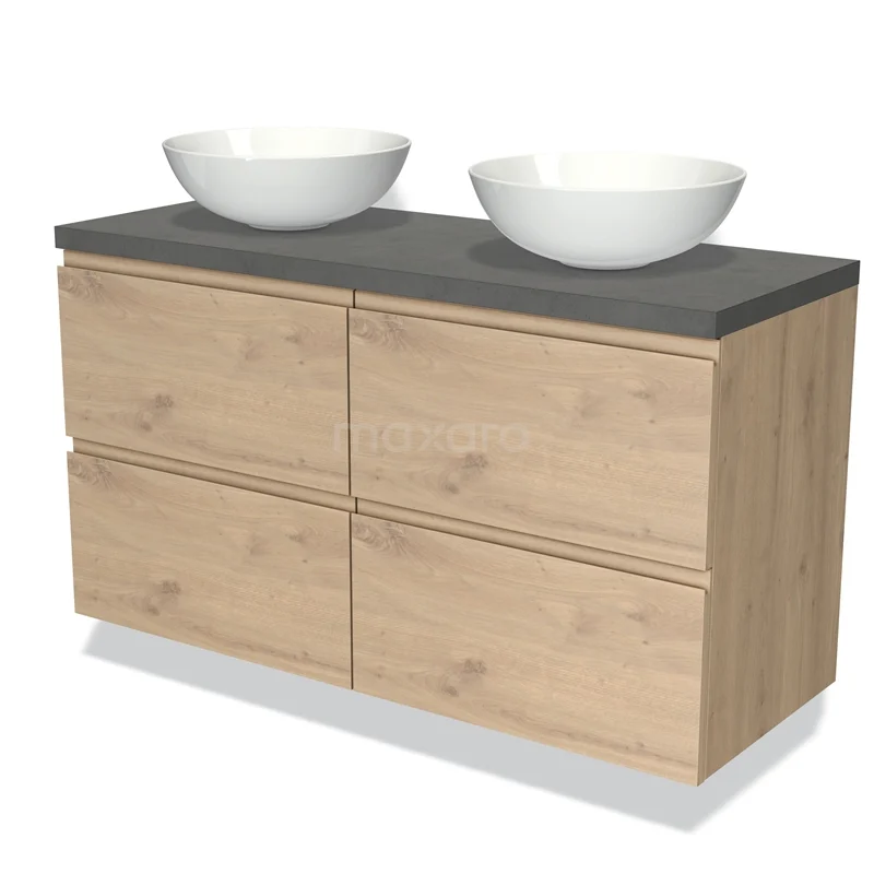 Modulo Plato Badmöbel mit Aufsatzwaschbecken | 120 cm Hellbraune Eiche Grifflos front Dunkelgrauer Beton blatt 4 Schubladen