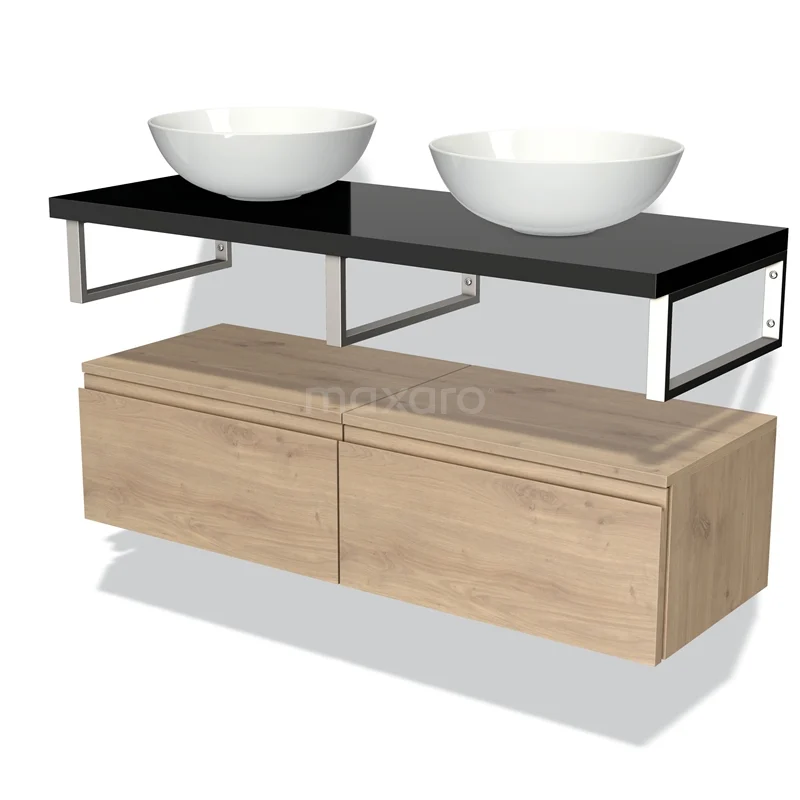 Modulo Plato Badmöbel mit Aufsatzwaschbecken | 120 cm Hellbraune Eiche Grifflos front Hochglanz Schwarz blatt Tief hängend