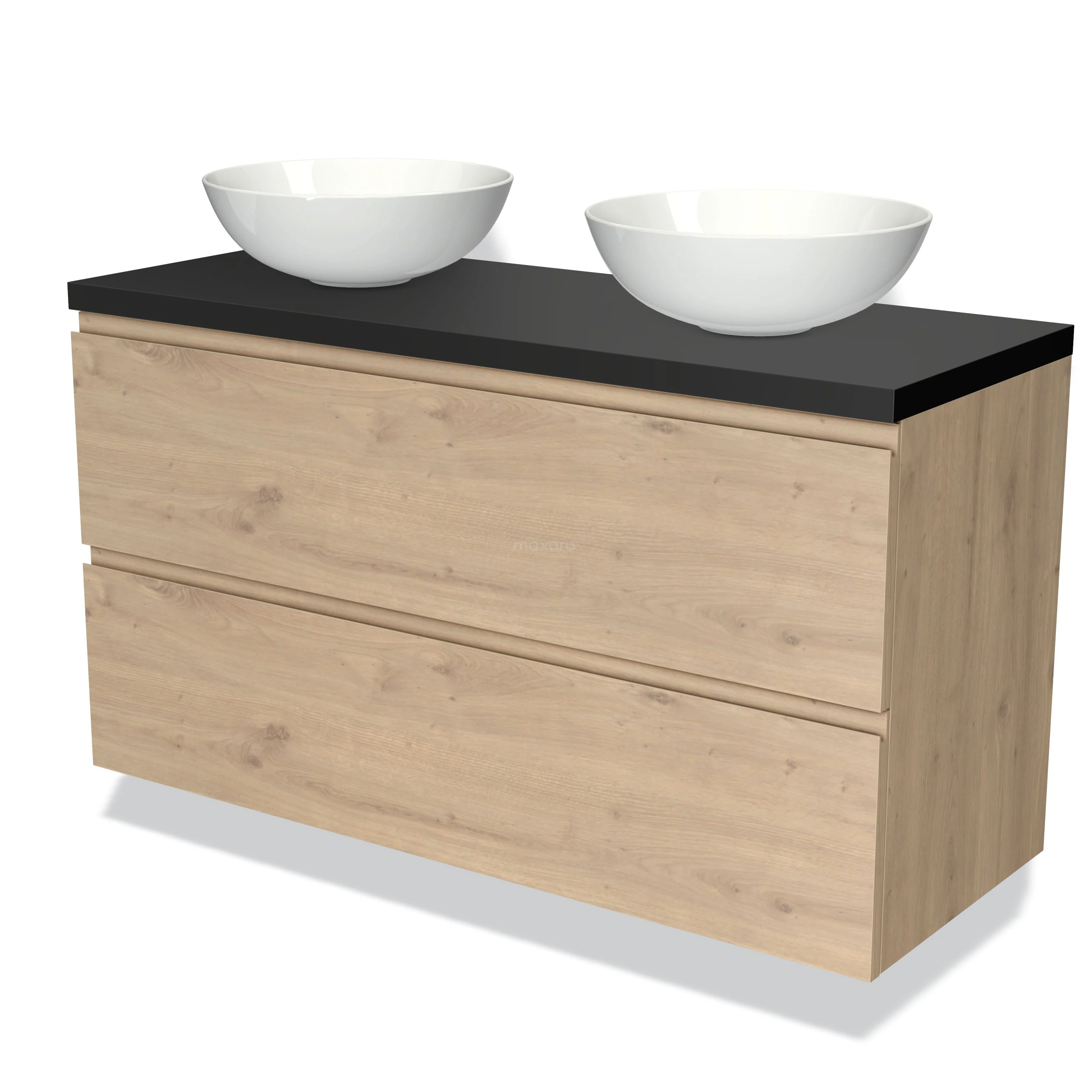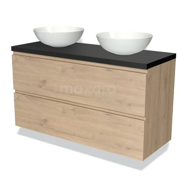 Modulo Plato Badmöbel mit Aufsatzwaschbecken | 120 cm Hellbraune Eiche Grifflos front Matt Schwarz blatt 2 übereinanderliegende Schubladen